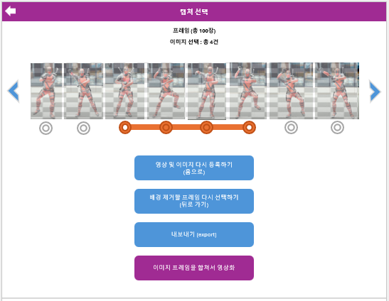 배경이 제거된 이미지들을 표시하고, 사용자가 원하는 구간을 선택하여 영상화 하거나 이미지를 내보내기 할 수 있는 화면