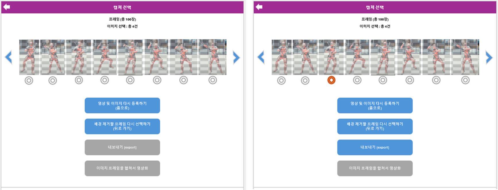 - '배경제거할 프레임 다시 선택하기' 버튼을 클릭할 경우, '이미지 프레임 선택' 화면 (본문 3)으로 돌아가서 이미지를 다시 선택한다.