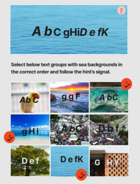 이미지의 일부 영역을 모자이크/블러/박스 등으로 가린 후, 사용자에게 특정 질문을 하거나 정답을 고르게 하여 사람임을 증명하게 하는 방식입니다.
