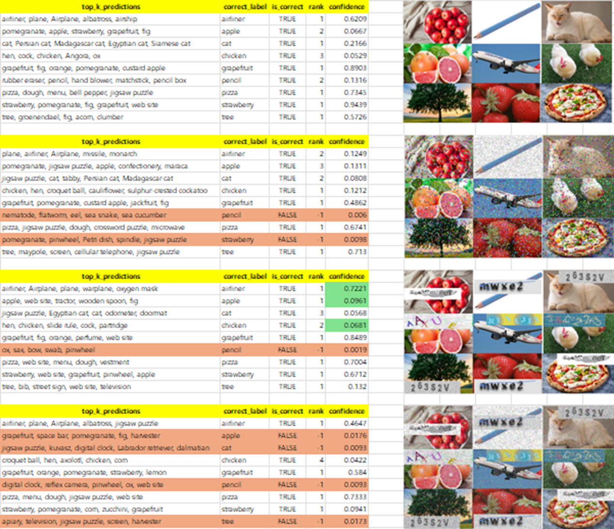 - 실험 예제 2 - 원본 이미지에 비해 오답도 있지만 Confidence 가 오히려 증가한 샘플도 있었다.