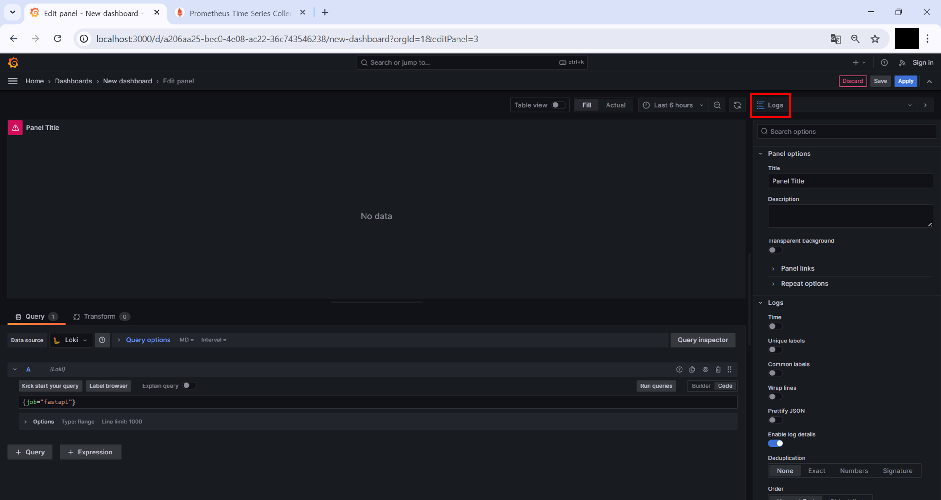Loki는 로그(logs) 를 다루는 시스템이기 때문에, 시각화 유형을 Logs로 선택해야 한다.