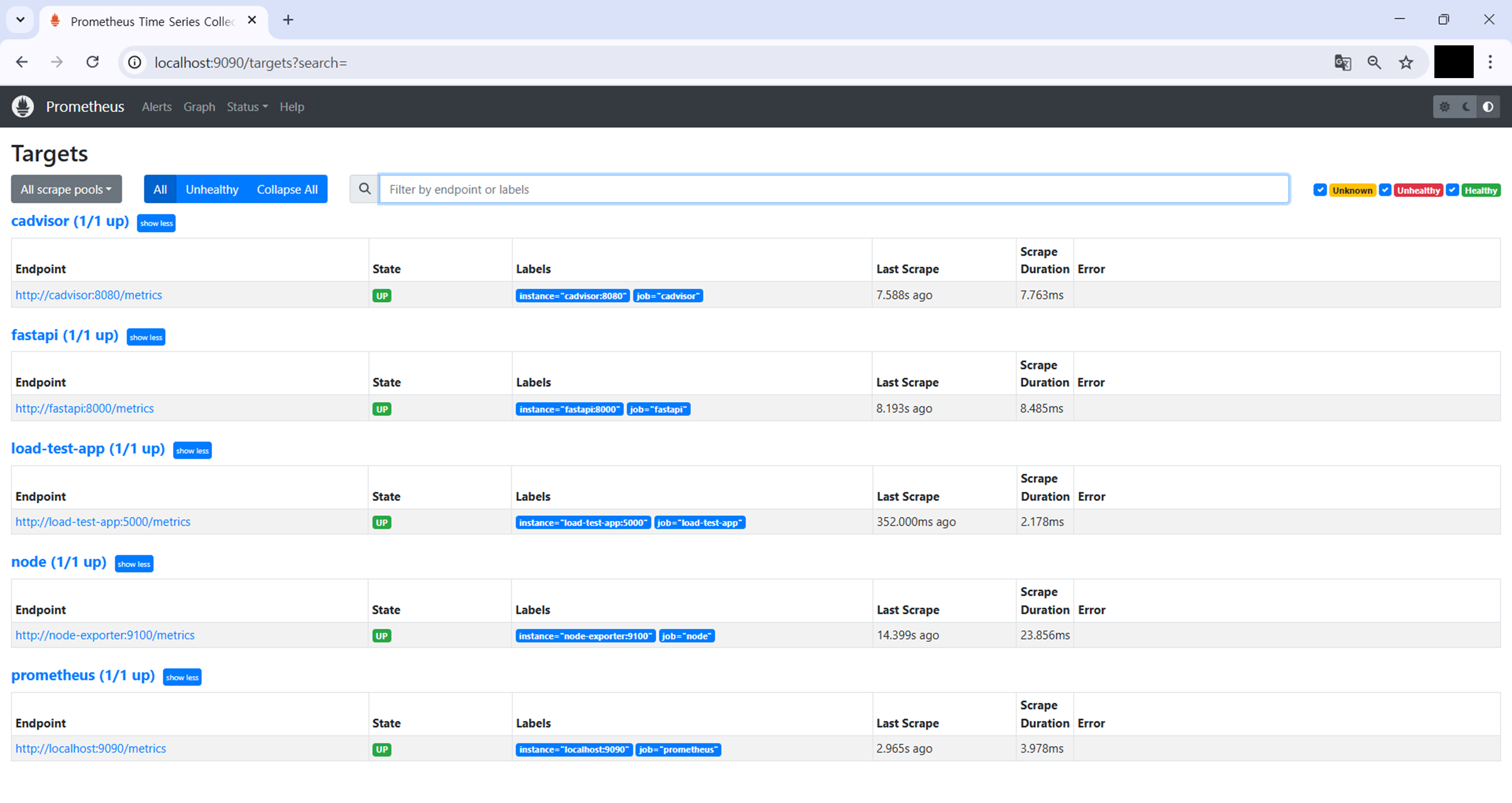 - Status > Targets 메뉴에서 모든 대상이 UP 상태인지 확인