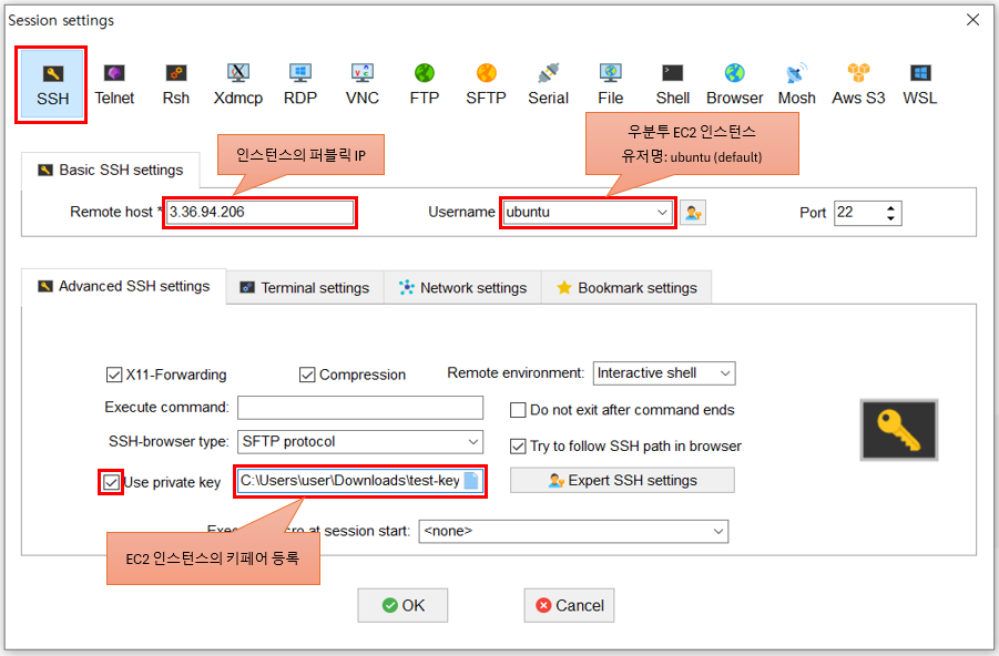 세션설정 창에서 SSH 버튼을 클릭한 후, 아래 정보를 입력