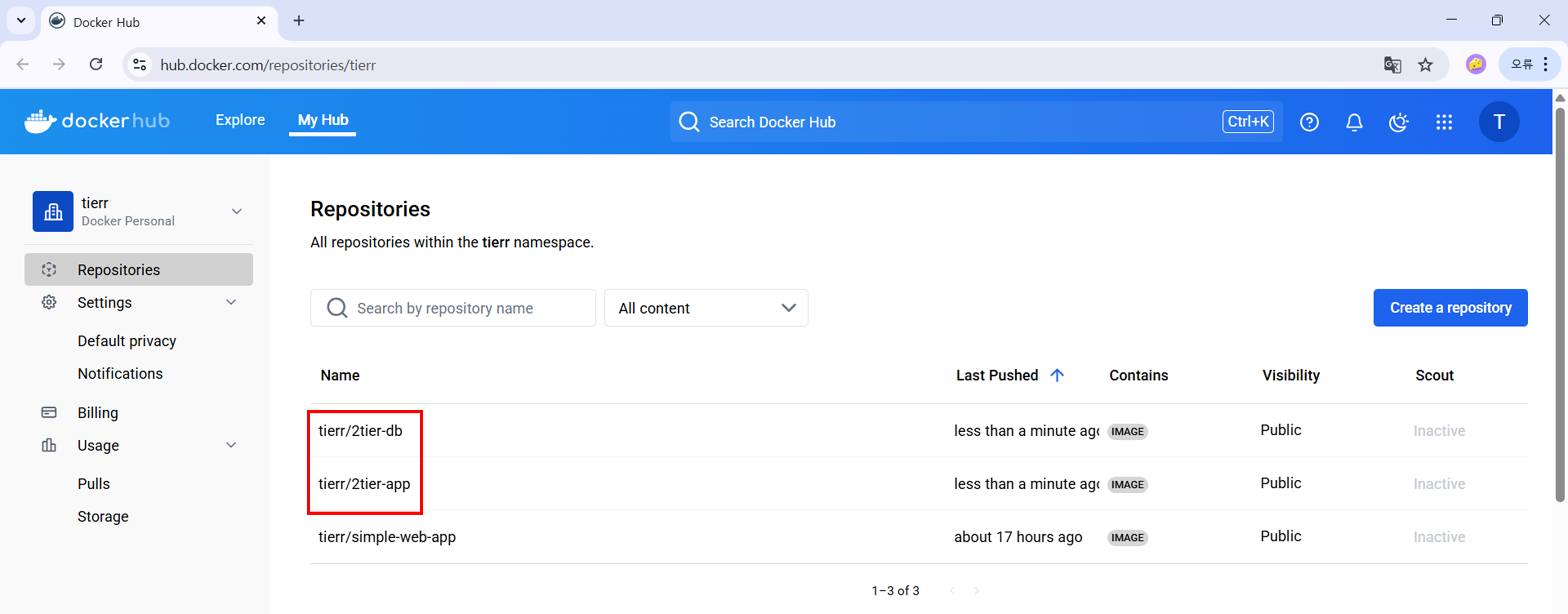 Docker Hub 저장소에 tierr/2tier-app:latest 이미지가 최신화되었을 것이다.