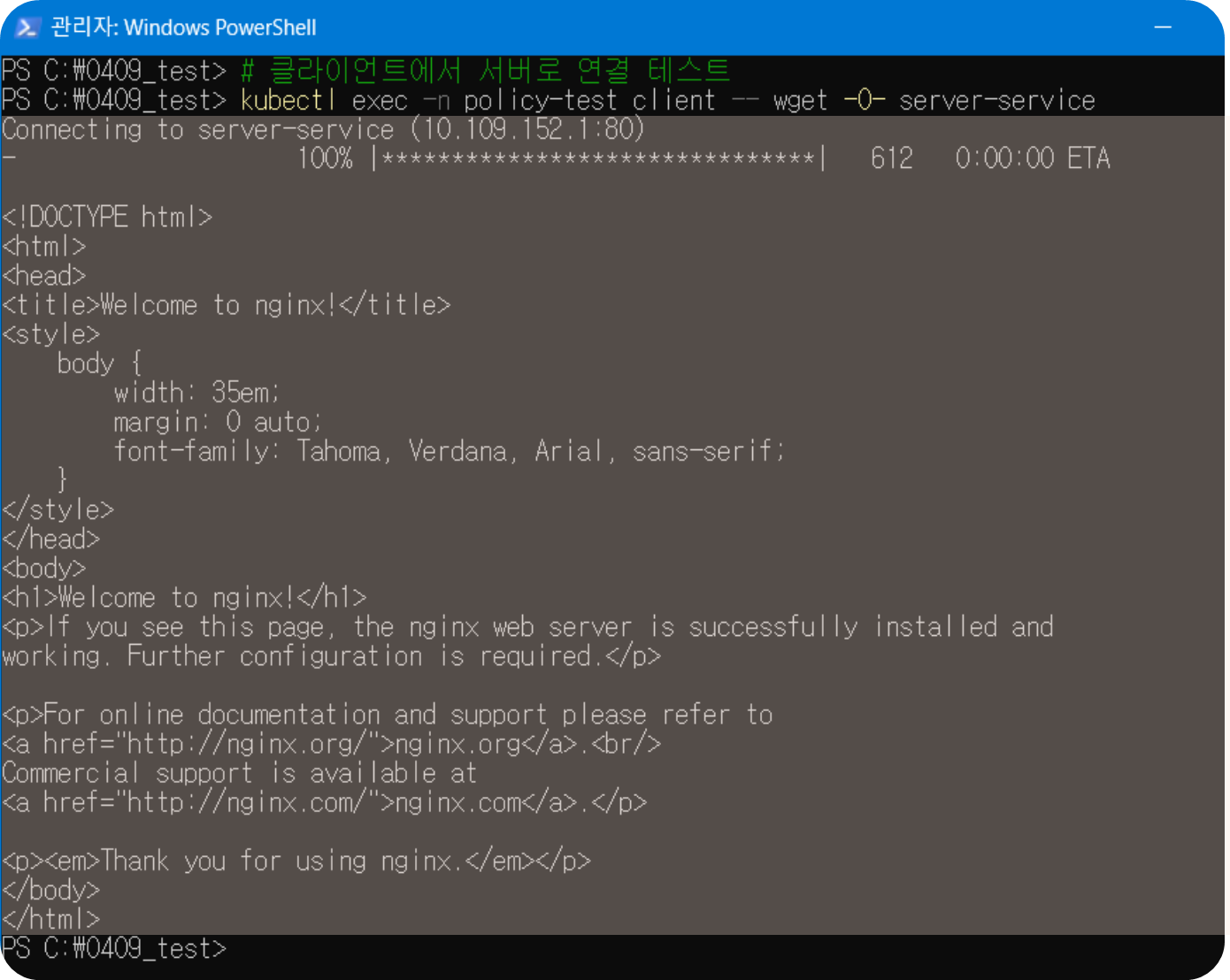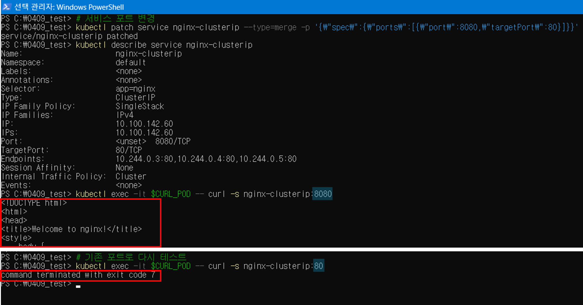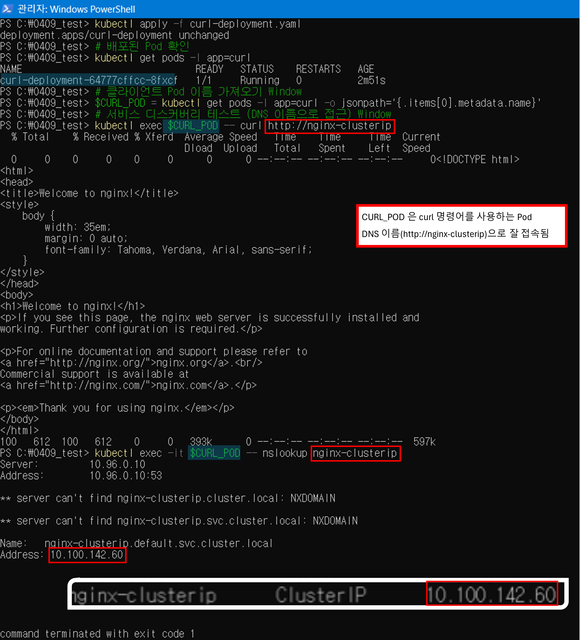 # ㄴ 서비스에 HTTP 요청 (nginx-clusterip라는 도메인으로 HTTP요청 전송): HTML, 텍스트 등 반환