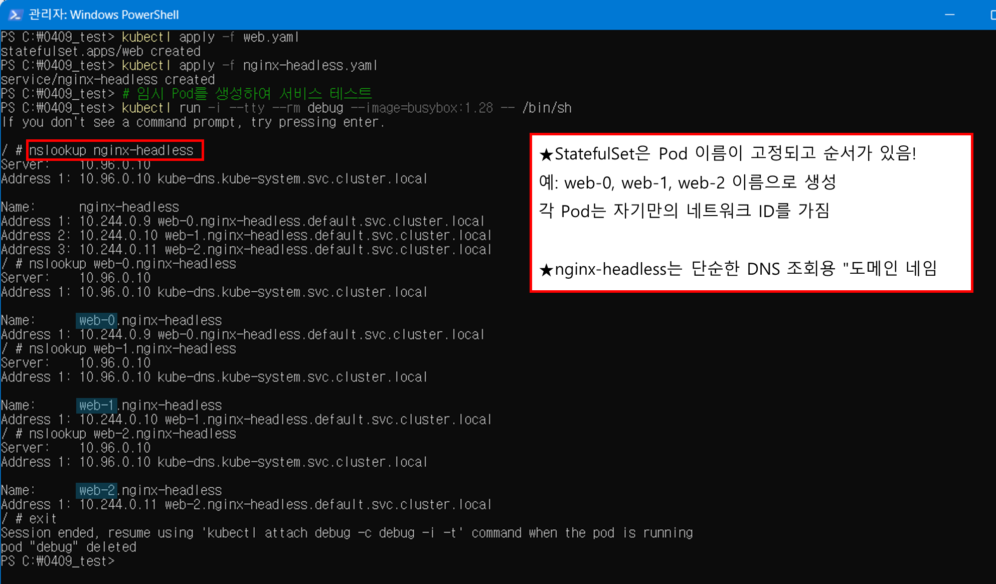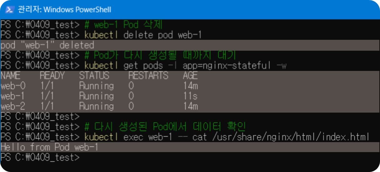 kubectl exec web-$i -- /bin/bash -c "echo 'Hello from Pod web-$i' > /usr/share/nginx/html/index.html"