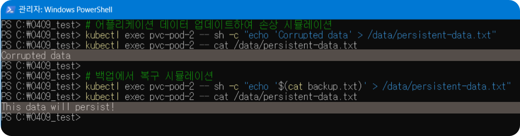 kubectl exec pvc-pod-2 -- sh -c "echo 'Corrupted data' > /data/persistent-data.txt"