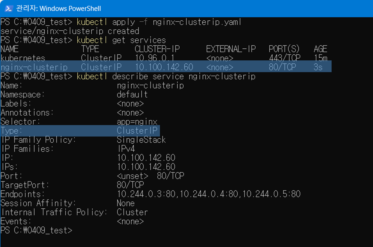 가장 기본적인 서비스 유형인 ClusterIP를 생성하고 테스트