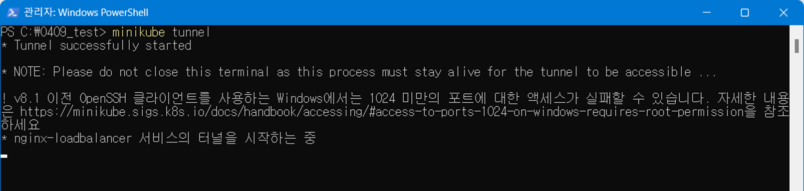 Minikube에서 LoadBalancer 타입의 서비스를 사용하려면 minikube tunnel 명령을 실행해야 함