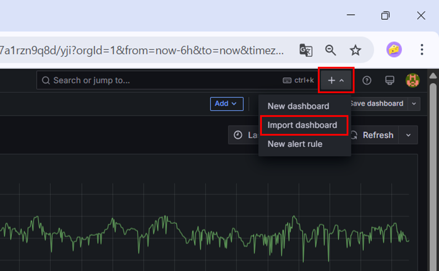 - 우측 상단 메뉴에서 "+" 버튼 클릭 > 드롭다운 메뉴 "Import dashboard" 선택