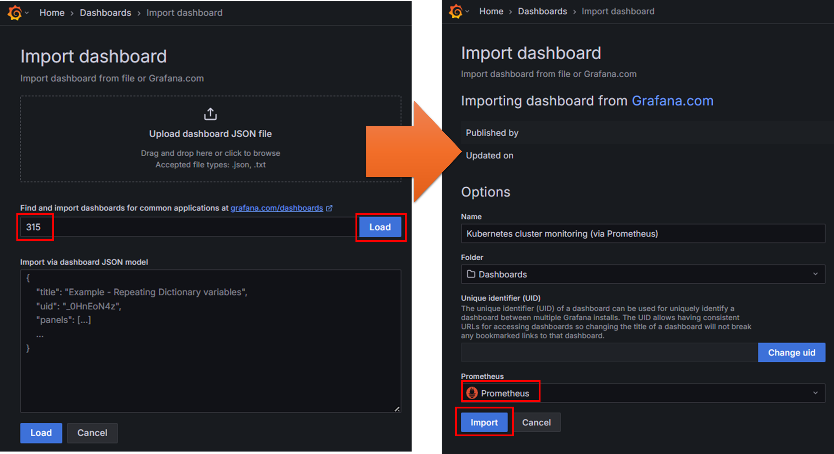 Grafana 우측 상단 메뉴 - grafana.com에서 유용한 대시보드 ID 입력 또는 JSON 파일 업로드
