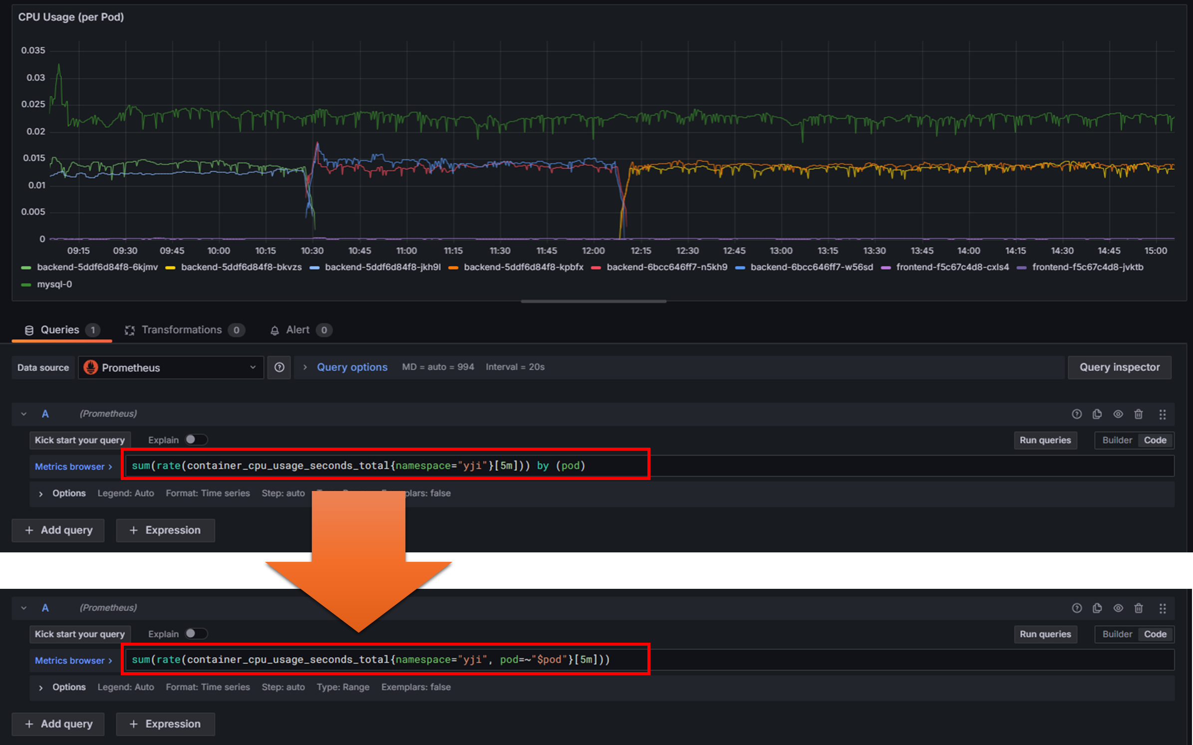 기존에는 이 패널이 모든 파드의 CPU 사용량을 표시했지만, 드롭다운에서 선택한 파드의 CPU 사용량을 표시하게 될 것이다.