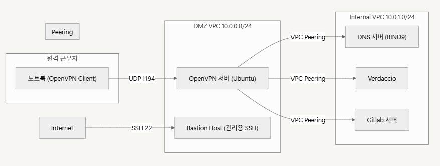 - DMZ VPC에 OpenVPN 서버를 두고 사내망(Private VPC)에 안전하게 접속