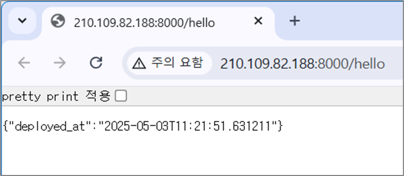 이전에 만든 FastAPI 앱이 /hello에서 배포 시각을 출력하도록 되어 있다면, 방금 워크플로우 실행 시각과 비교해서 최신으로 바뀌었는지 확인하세요.