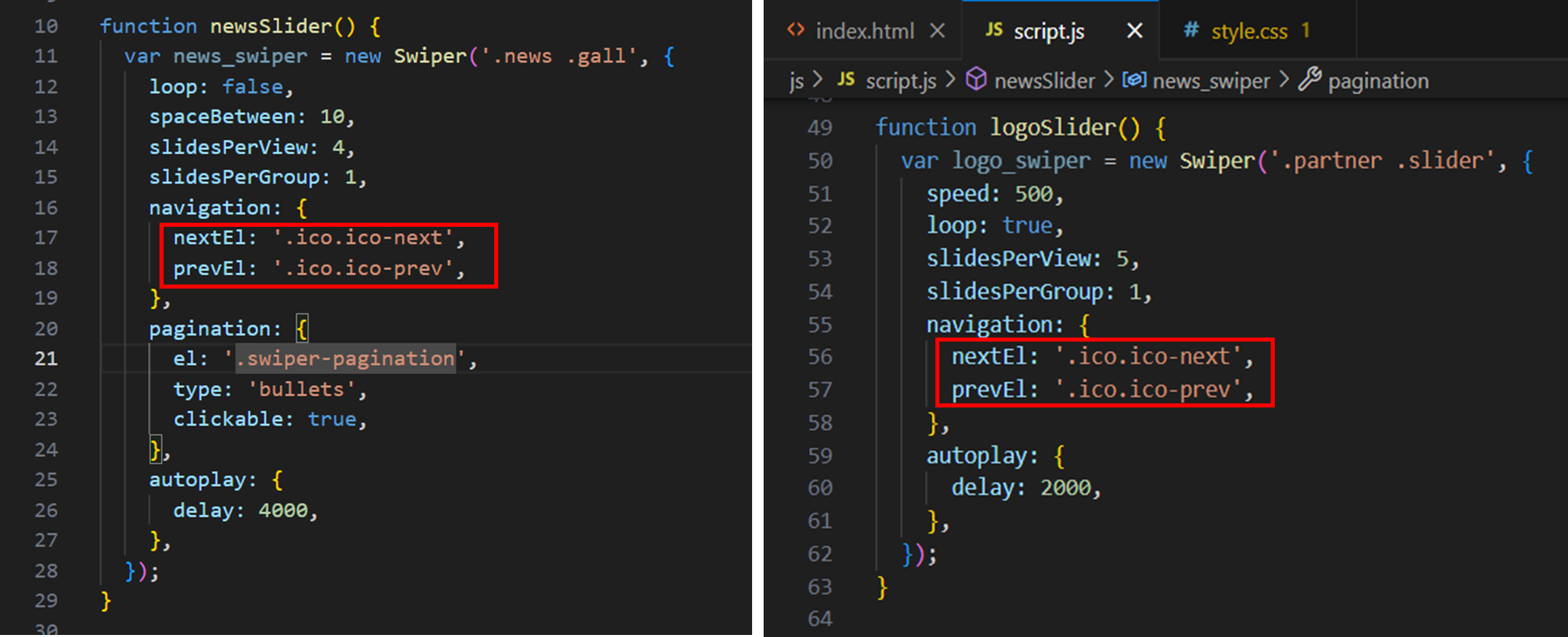 - script.js 에서 두 슬라이드의 navigation 설정의 DOM 요소 선택자가 같기 때문에 영향을 미친다.