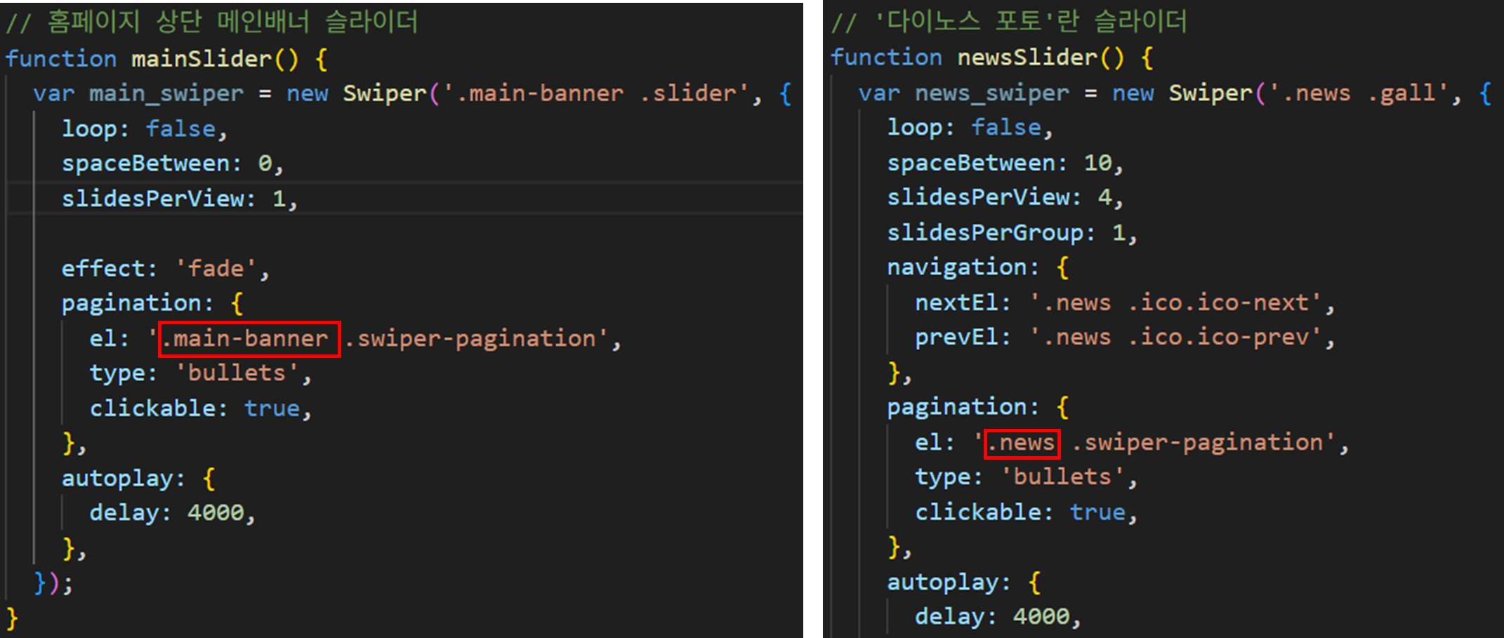 - mainSlider()는 먼저 초기화되며, 문서 전체에서 .swiper-pagination을 먼저 찾아서 news 슬라이더용 pagination을 잘못 잡음