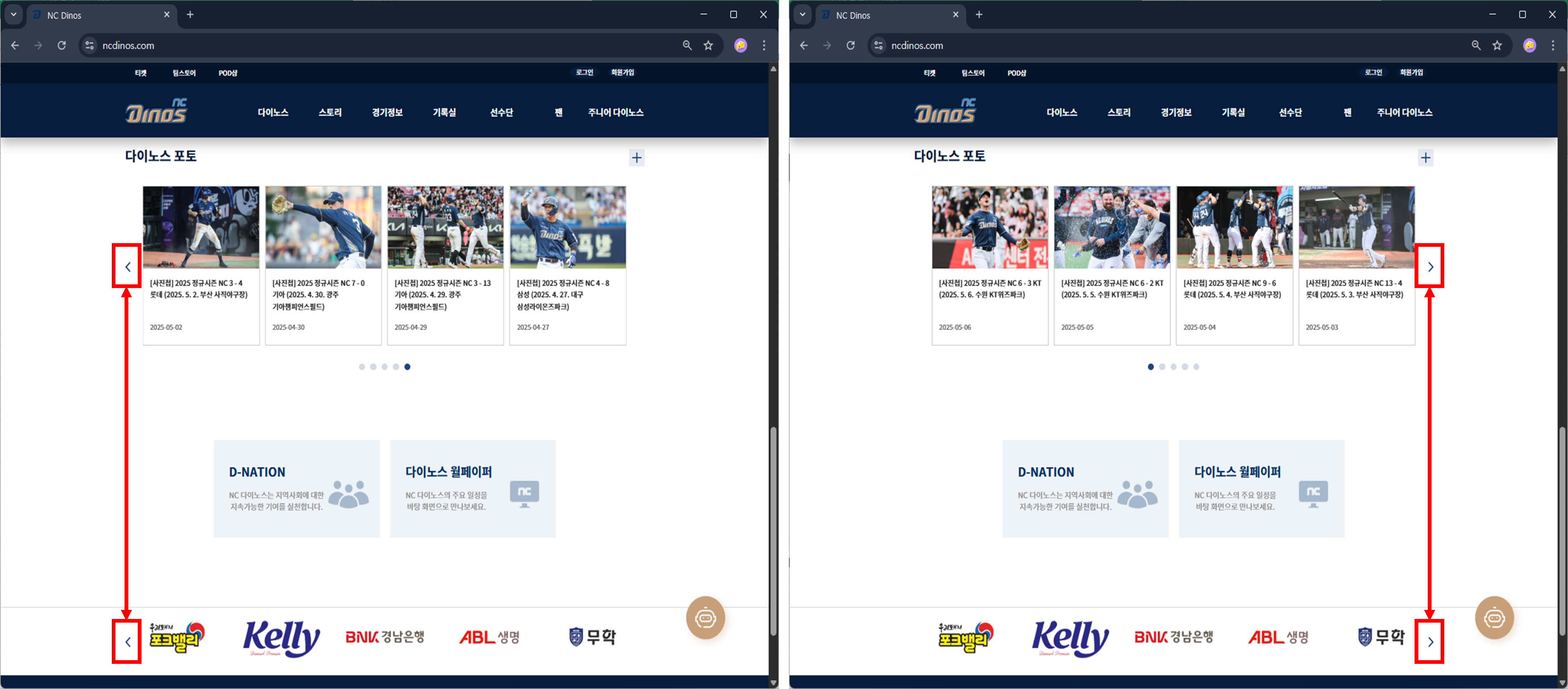 - 하단 후원사 슬라이드의 버튼도 다이노스 포토와 동일하게 표시된다. 후원사 슬라이드는 첫장과 마지막이 존재하지 않고 반복되므로 이동 버튼이 사라질 필요는 없다. (아마도 비정상)