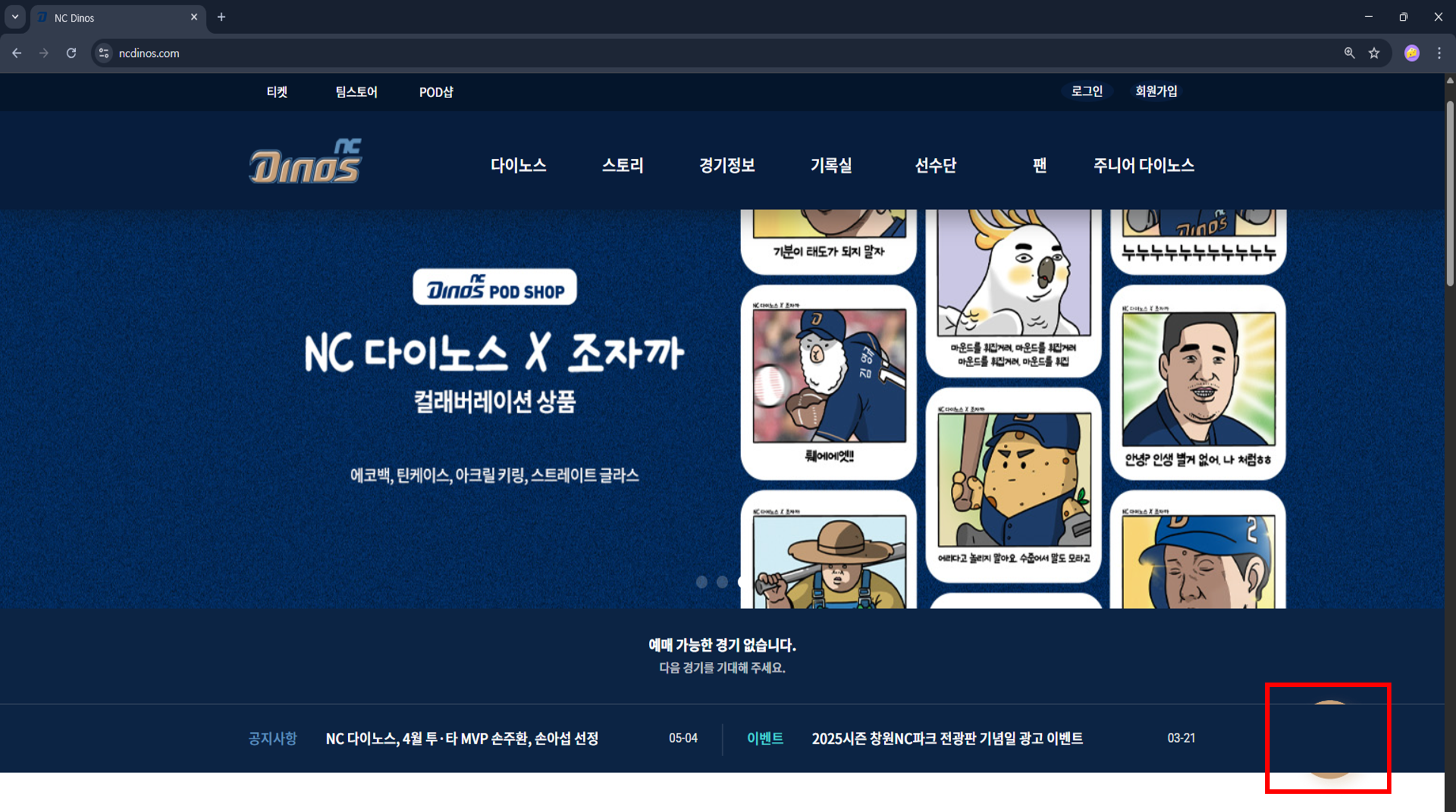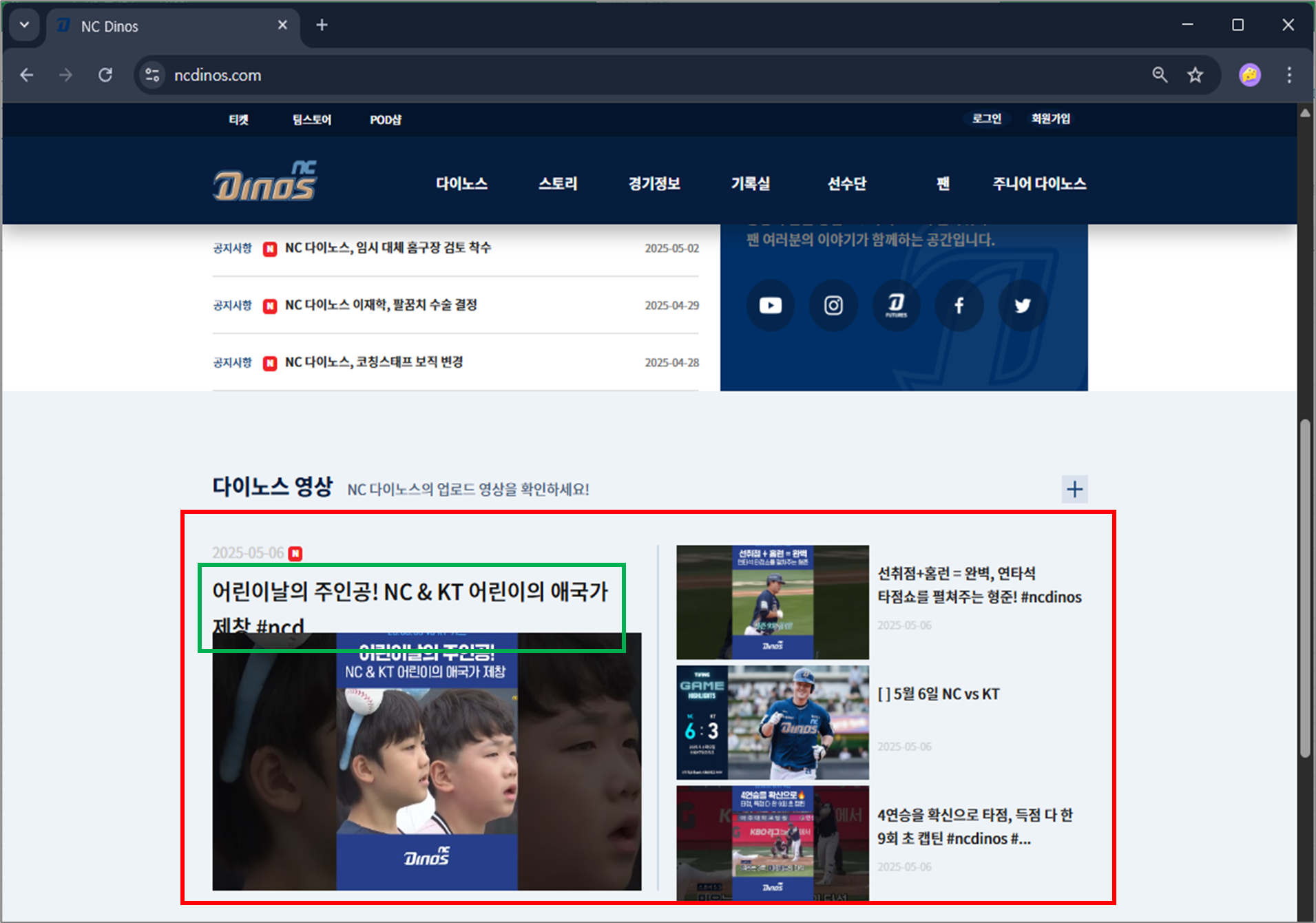 유튜브 등의 외부 사이트를 참고하는 링크만 남겨두고, NC Dinos의 내부 사이트로 이동하는 링크는 전부 막아놨다.