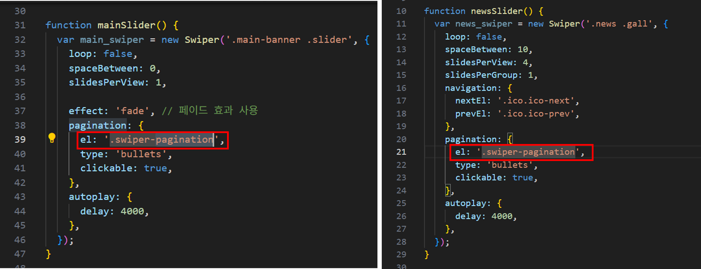 - script.js 에서 두 슬라이드의 pagination 설정의 DOM 요소 선택자가 같기 때문에 영향을 미친다.