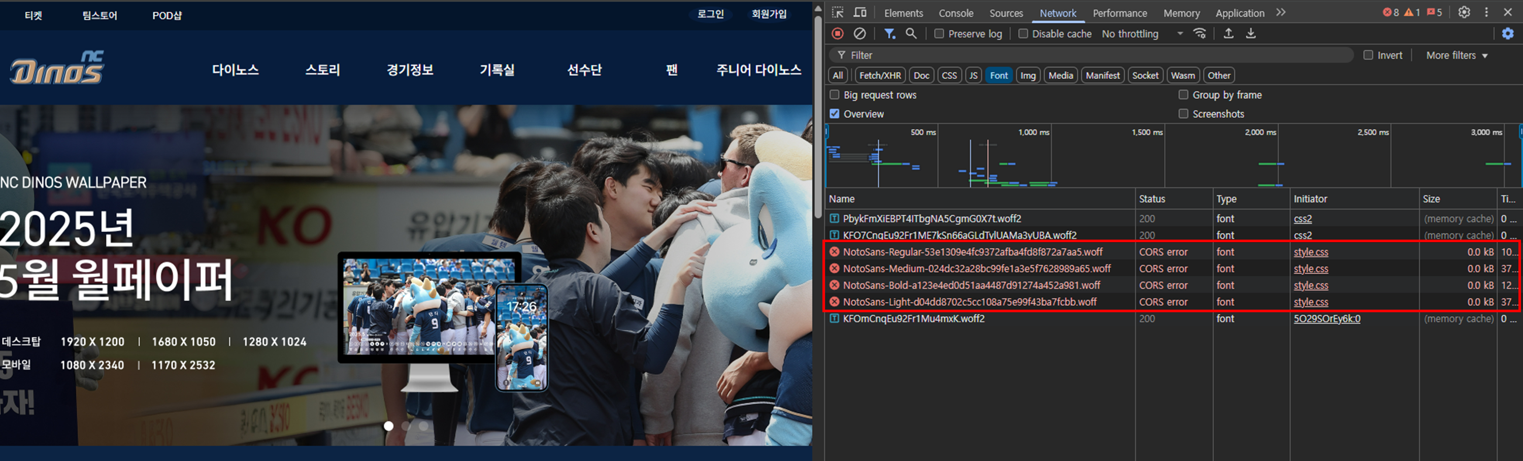 개발자모드의 Network 탭에서 확인해보면, CSS 코드에 Import는 되어있지만, 실제로는 불러오지 못하고 있다. 이 경우는 CORS(Cross-Origin Resource Sharing) 정책으로 인해 폰트 로딩이 차단되어 웹폰트 링크를 외부 사이트에서 사용하지 못한다.